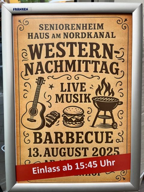 Im „Haus am Nordkanal“ zog der Wilde Westen ein: Bei Sonnenschein gab es frisch Gegrilltes, kleine Burger und Musik von Gerd Pelka. Neben beliebten Schlagern erklangen auch englische Ohrwürmer – ein Zeichen dafür, dass sich das Musikrepertoire auch bei uns langsam wandelt. Mit viel Herzblut vom Team der Sozialen Betreuung vorbereitet, wurde der Nachmittag zu einem echten Sommer-Highlight.